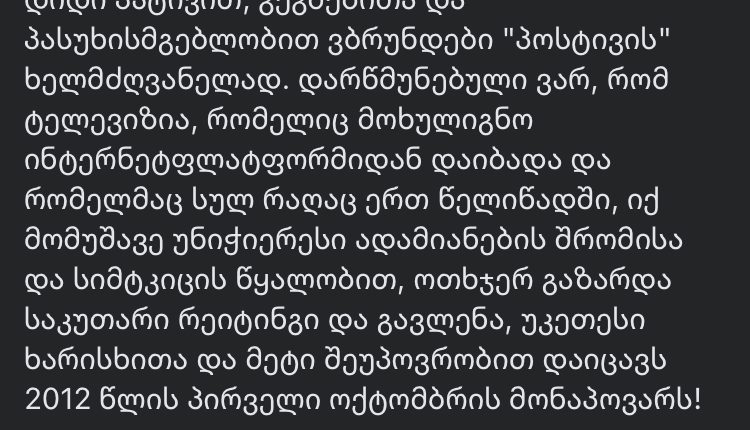 “დიდი პატივით, გეგმებითა და პასუხისმგებლობით ვბრუნდები “პოსტივის” ხელმძღვანელად. დარწმუნებული ვარ, რომ ტელევიზია, რომელიც მოხულიგნო ინტერნეტფლატფორმიდან დაიბადა და რომელმაც სულ რაღაც ერთ წელიწადში, იქ მომუშავე უნიჭიერესი ადამიანების შრომისა და სიმტკიცის წყალობით, ოთხჯერ გაზარდა საკუთარი რეიტინგი და გავლენა, უკეთესი ხარისხითა და მეტი შეუპოვრობით დაიცავს 2012 წლის პირველი ოქტომბრის მონაპოვარს!”, – წერს ნაცვლიშვილი სოციალურ ქსელში.