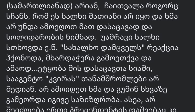 “ეს 16 თებერვალს გამოვაქვეყნე, სააგენტო “კვირას” ჟურნალისტებს რომ დაესხნენ თავს და ოპერატორი ბიჭი სცემეს, ხოლო გოგონას სიტყვიერი შეურაცხყოფები მიაყენეს და სტრესში ჩააგდეს. მაშინ ზოგიერთებისგან, ახლა რომ უკიდურესად აღშფოთებულები (სამართლიანად) არიან, ჩაითვალა როგორც ჩანს, რომ ეს ხალხი მათიანი არ იყო და ხმა არ უნდა ამოეღოთ მათ დასაცავად და სოლიდარობის ნიშნად. უამრავი ხალხი სთხოვდა ე.წ. “სახალხო დამცველს” რეაქცია ჰქონოდა, მხარდაჭერა გამოეთქვა და ამაოდ…ეტყობა მის დასაცავთა სიაში, სააგენტო “კვირას” თანამშრომლები არ შედიან. არ ამოიღეთ ხმა და გუშინ სხვაზე გამეორდა იგივე საზიზღრობა. ასეა, არ შეიძლება ერთი პრეცენდენტის დაშვებაც კი, გაჩუმება, მეორე გვერდზე გადაბრუნება და თავის მოკატუნება, თითქოს არაფერიც არ მომხდარა. ეს არ არის ნორმალური, ეს არ არის პროფესიული და ადამიანური სოლიდარობა”,- წერს სალუქვაძე.
